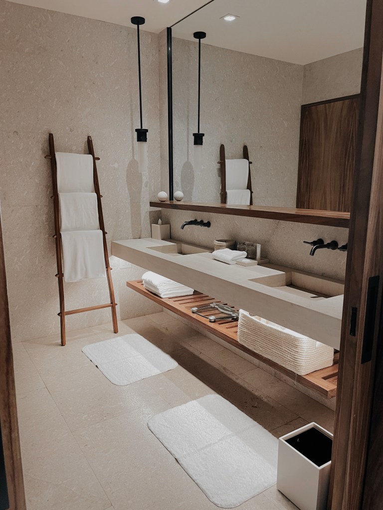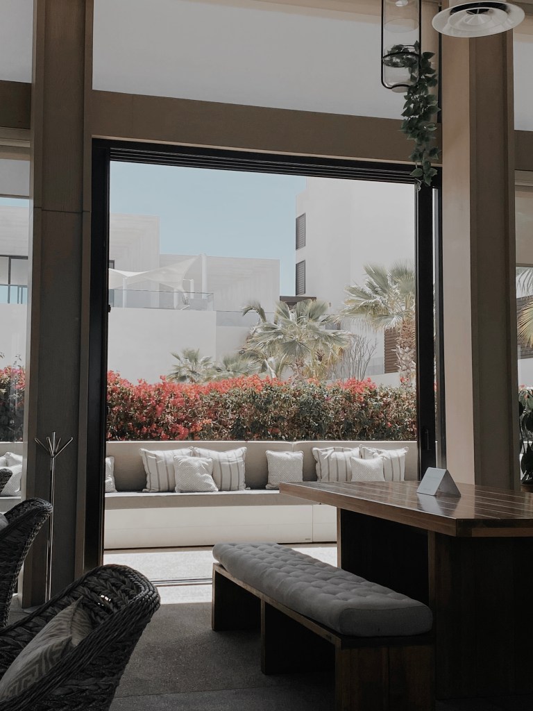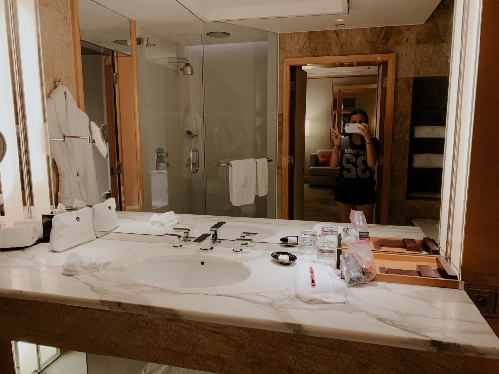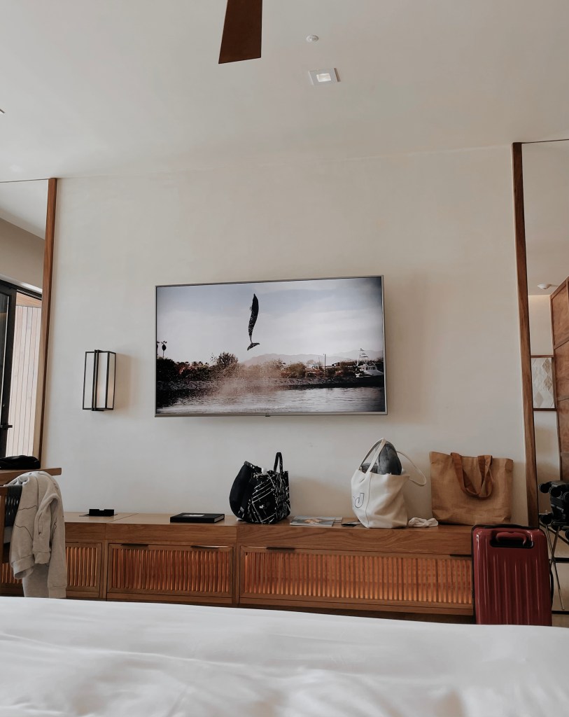 Our hotel room was one of a kind. With many wooden accents and unique, desert landscaping right outside, we were put into another world. The sliding doors came with remote controllable curtains that allowed us to open the blinds from the other side of the room! It definitely made opening the blinds in the morning much more fun! Our TV had live options as well as Google Chromecast – I was able to connect my phone to the TV and play music using Spotify or watch my favorite shows on Netflix. Every night, my Mom and I binged season 5 episodes of Selling Sunset! We couldn’t get enough! Further, the room came with a personal tote bag that you are allowed to use throughout your stay and is available for purchase at the resort store. This made it quite easy for us to keep all of our pool/beach belongings together!