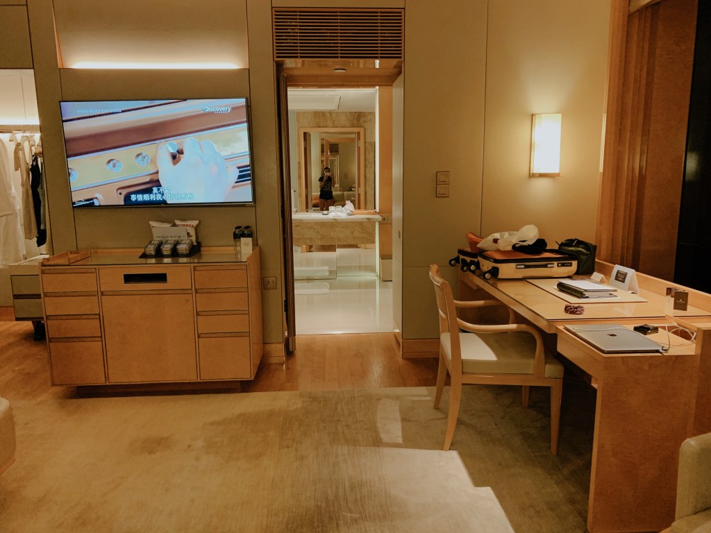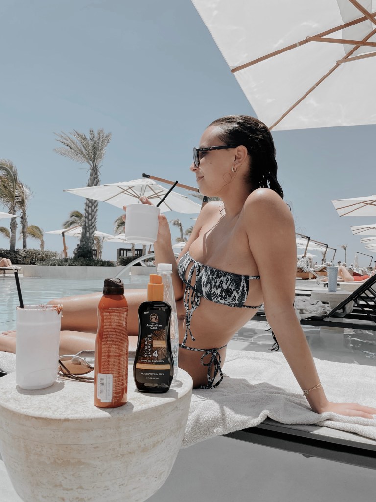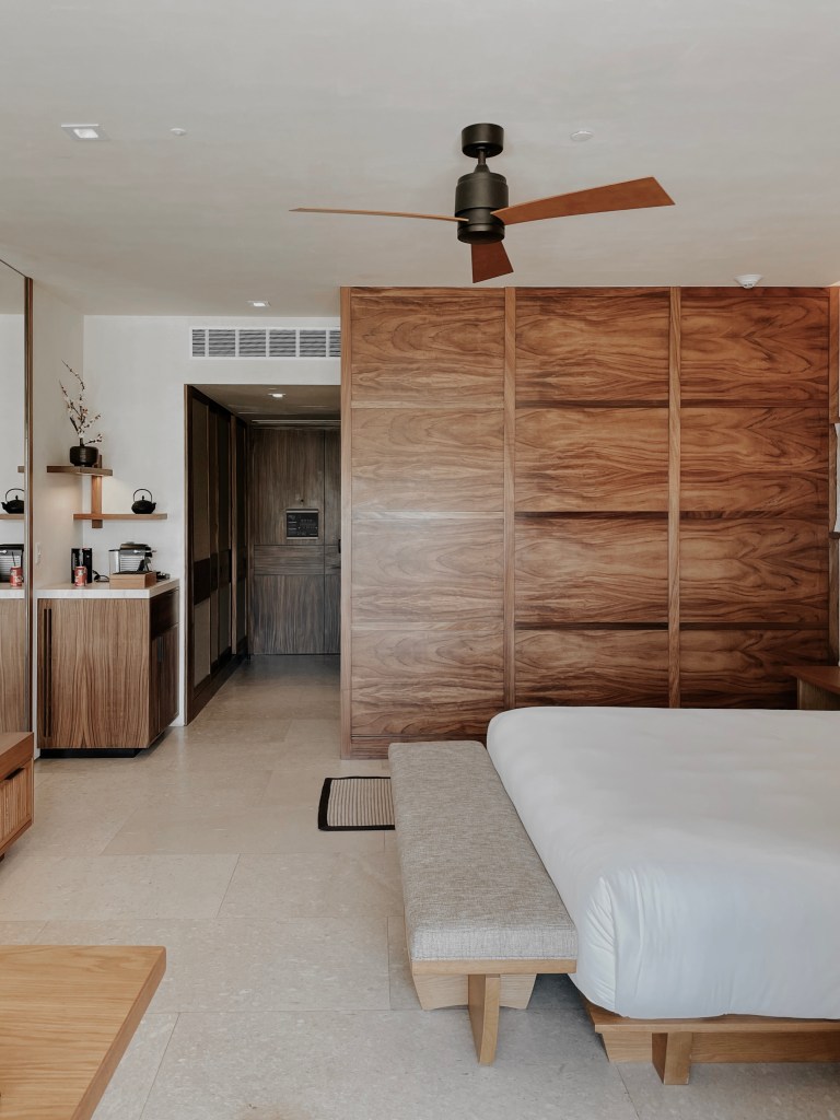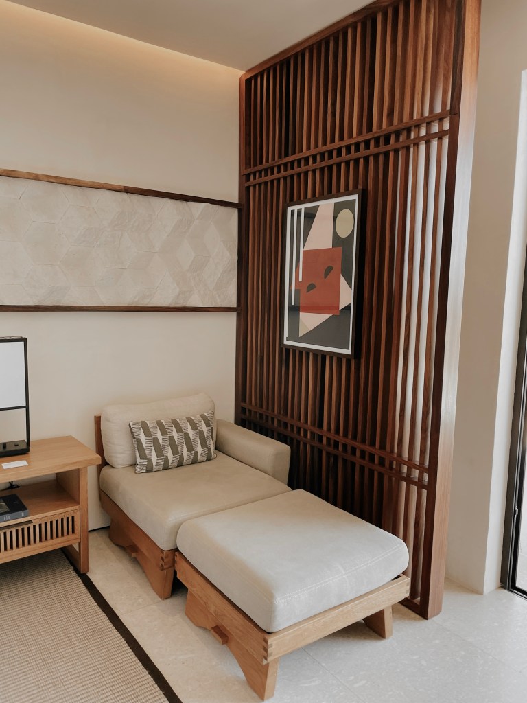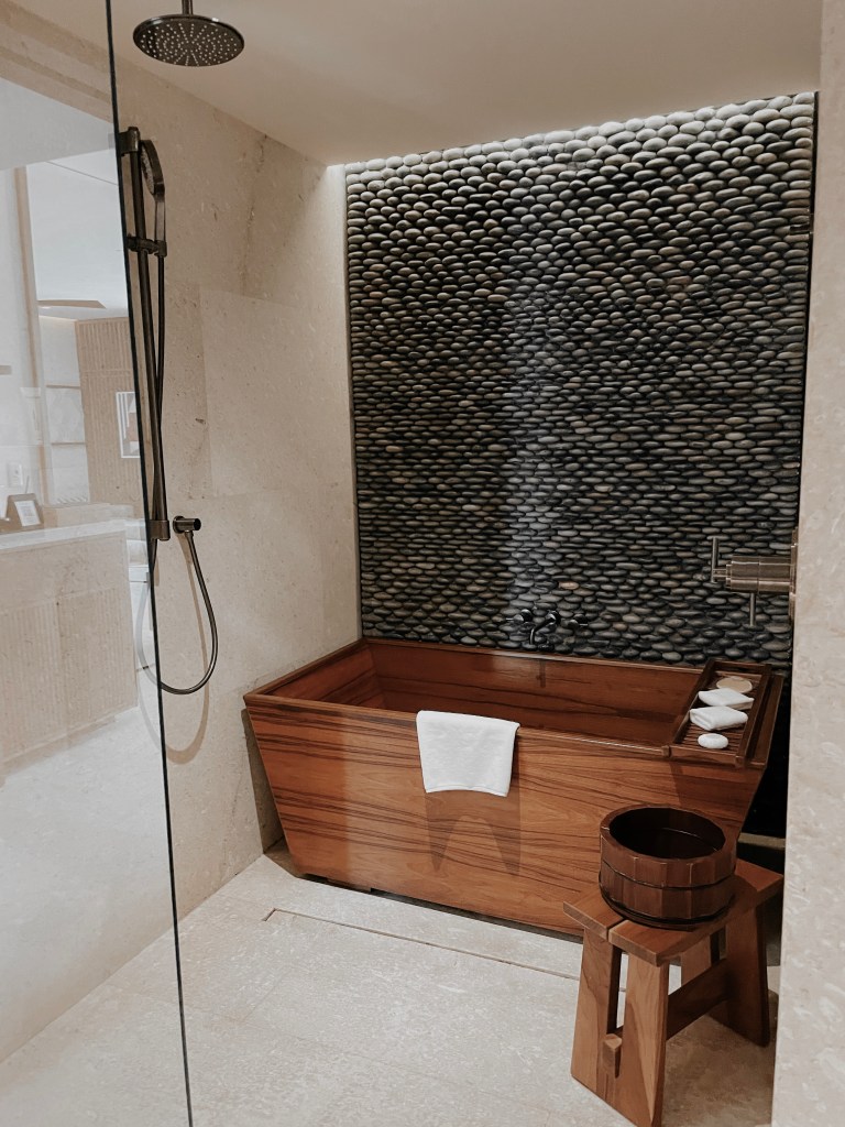 Our hotel room was one of a kind. With many wooden accents and unique, desert landscaping right outside, we were put into another world. The sliding doors came with remote controllable curtains that allowed us to open the blinds from the other side of the room! It definitely made opening the blinds in the morning much more fun! Our TV had live options as well as Google Chromecast – I was able to connect my phone to the TV and play music using Spotify or watch my favorite shows on Netflix. Every night, my Mom and I binged season 5 episodes of Selling Sunset! We couldn’t get enough! Further, the room came with a personal tote bag that you are allowed to use throughout your stay and is available for purchase at the resort store. This made it quite easy for us to keep all of our pool/beach belongings together!